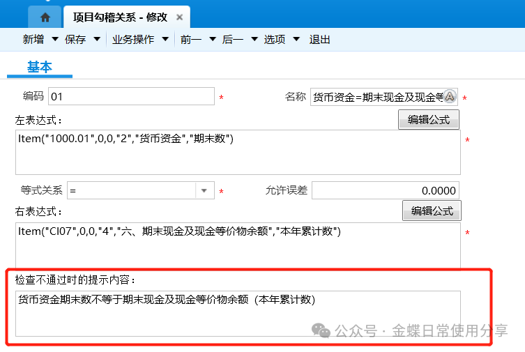 2.在“检查不通过时的提示内容”文本框中维护相应信息,作为报表项目数据检查不满足勾稽关系时提示的内容;