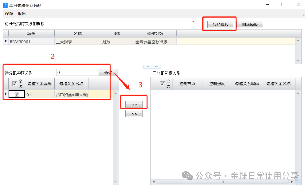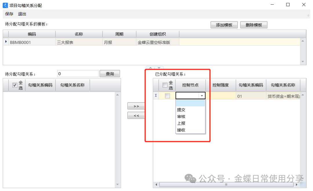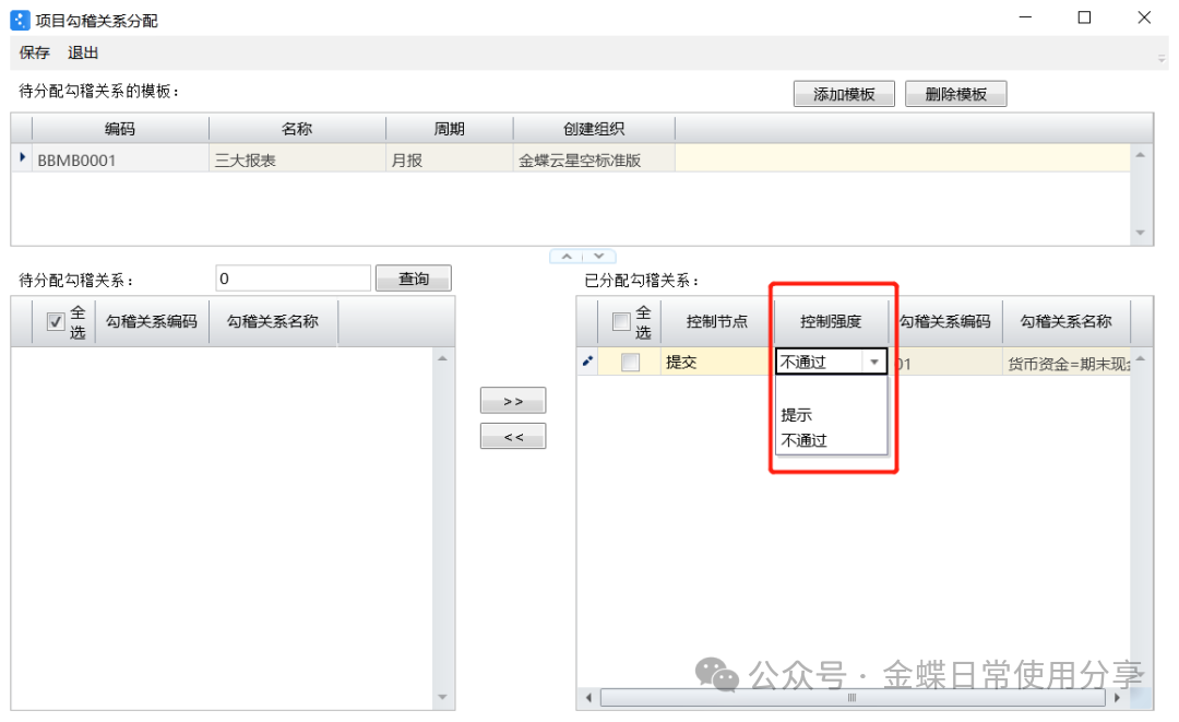 【操作说明】:新建项目勾稽关系分配:添加报表模板,将待分配勾稽关系选择分配到“已分配勾稽关系”中;