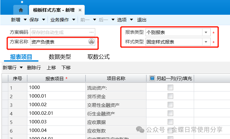 业务场景】:在编制报表模板时可直接填充模板样式方案,因此可在方案中确定报表样式,填充的内容以及各表项的取数公式。该方案被保存和管理后,可方便灵活的用于后期任意报表的定义。