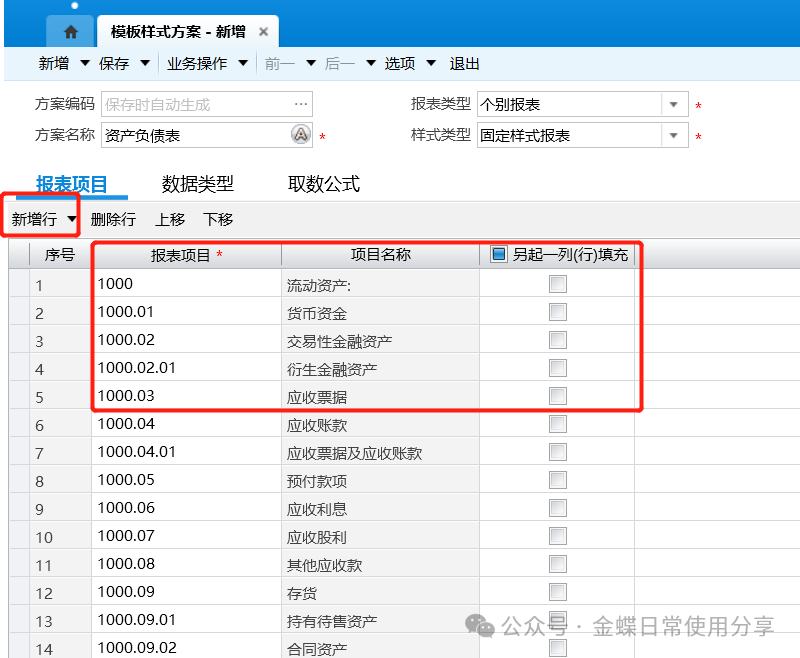 1.报表项目:通过“新增行”操作选择报表中需要列示的报表项目,并选择是否需要“另起一列(行)填充”;