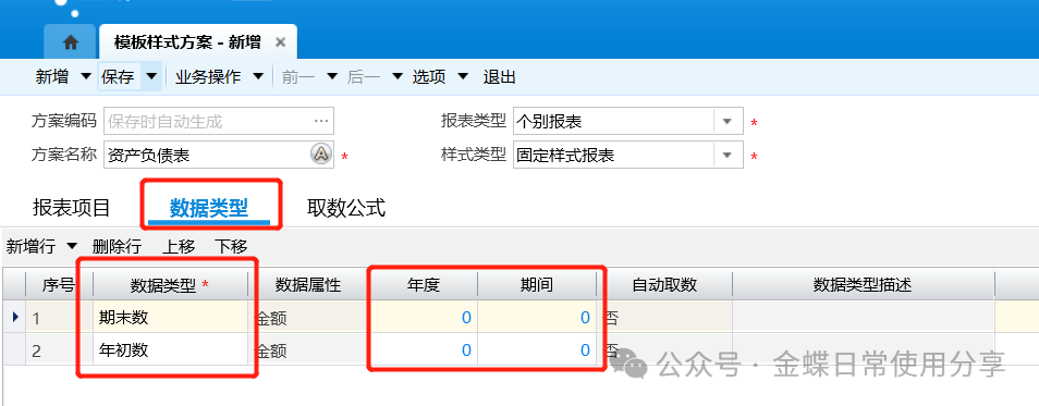 2.数据类型:选择报表项目的数据类型,并维护年度和期间(建议保持默认值0,当年度、期间=0时,指的是报表的本年本期);
