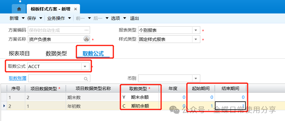 3.取数公式:选择模板样式方案的取数公式,并选择每个项目数据的取数类型(期末数一般取期末余额,年初数一般取期初余额),维护起始期间和结束期间;