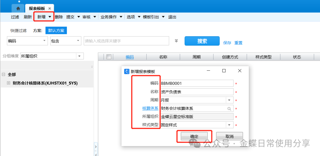 【操作说明】:点击【新增】按钮,弹出【新增报表模板】框,输入报表名称,选择对应的周期、核算体系、所属组织、样式类型,点击【确定】按钮;