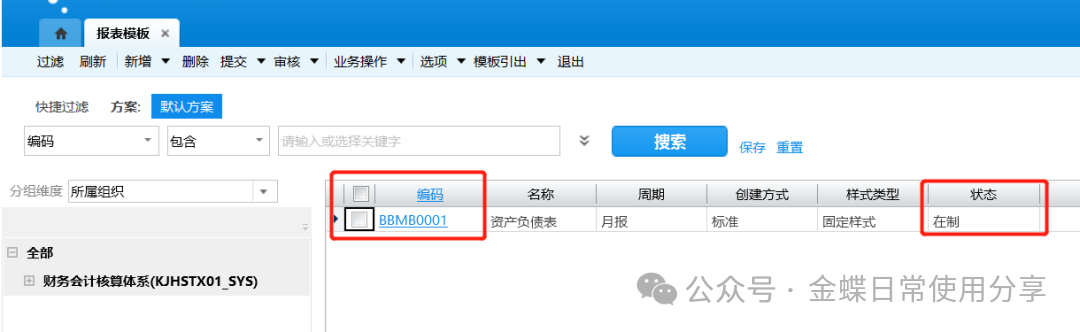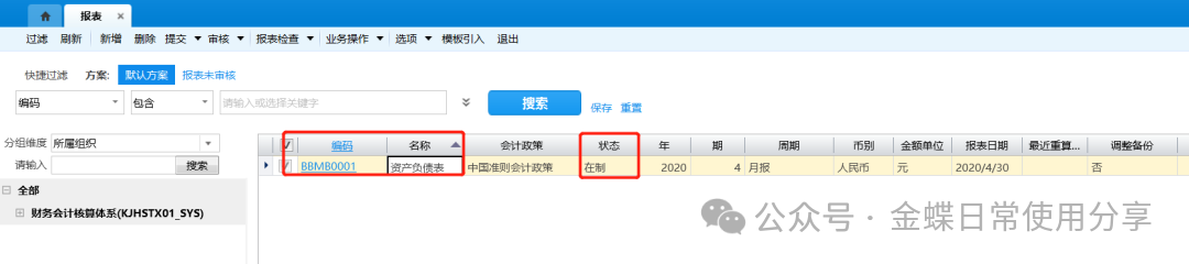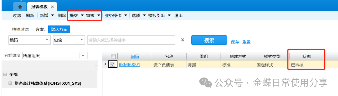 4.修改完成后保存报表模板,并将报表模板【提交】、【审核】,审核后报表模板的状态从“在制”变为“已审核”;