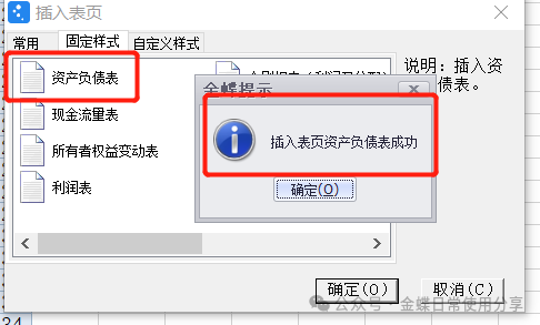 (1)插入系统预置表页:鼠标右键点击表页标签(表页标签如:sheet1),选择【插入表页】,在弹出的“插入表页”对话框的【报表样式】页签中,选择需要插入的报表样式(如资产负债表),点击【确定】按钮,系统会显示“插入表页XX报表成功”;