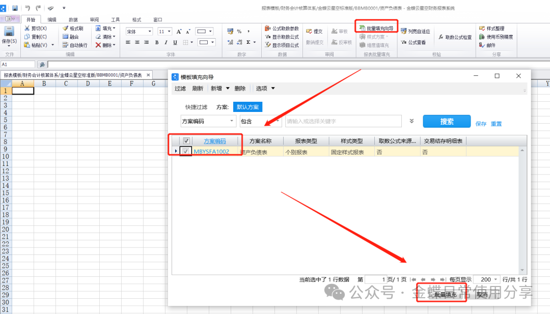 (2)批量填充模板样式方案:点击【批量填充向导】,在弹出的模板填充向导对话框中选择需要填充的模板样式方案,选择完成后点击【批量填充】;