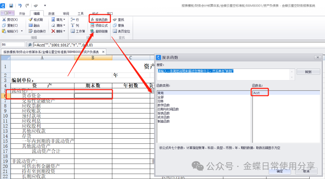 (1)选中需要编辑取数来源或者取数公式的单元格,点击【编辑】下的【报表函数】,选择具体函数(如Acct),点击【确定】;