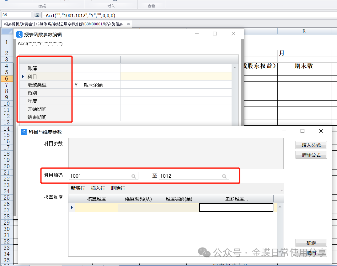 (2)在报表函数参数编辑对话框中维护科目、取数类型、币别、年度、开始期间以及结束期间等信息;