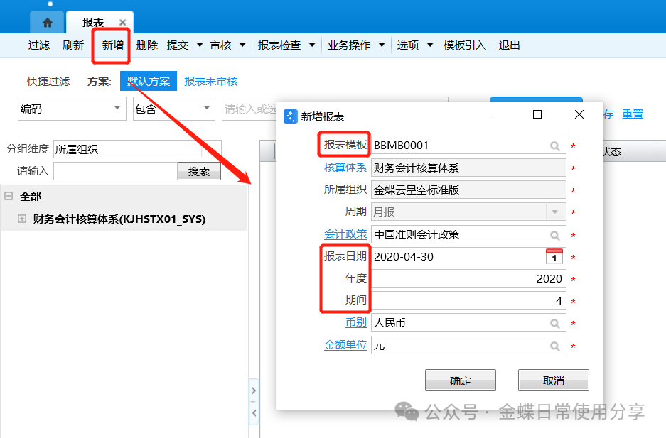 【操作说明】:点击【新增】按钮,弹出【新增报表】框,选择对应的报表模板,报表日期、年度、期间,点击【确定】按钮;