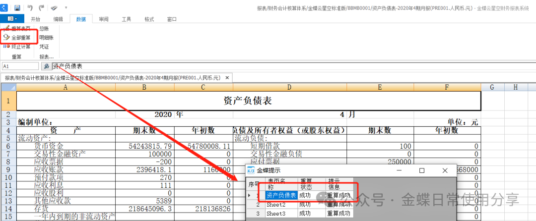 2.点击【数据】下的【全部重算】按钮,系统会自动重新计算所有表页。若点击【重算表页】按钮,则系统只会自动重新计算当前表页。系统会根据定义好的取数公式以及公式参数进行取数。系统会提示是否重算成功;
