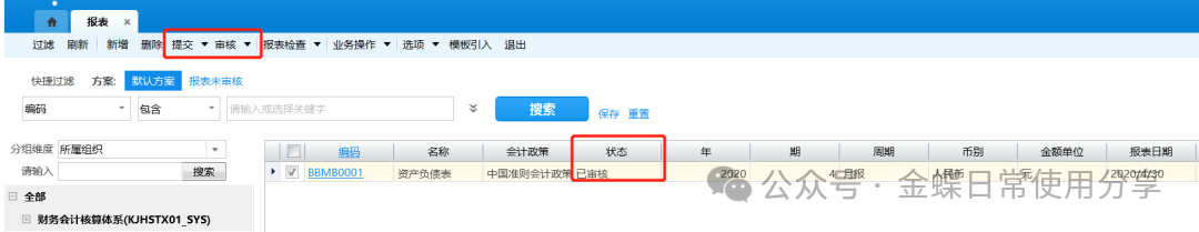 3.重算完成后保存报表,并将报表【提交】、【审核】,审核后报表的状态从“在制”变为“已审核”;