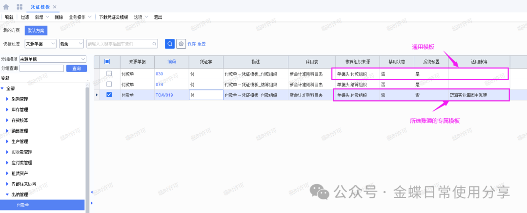 若适用账簿为空,则表示为通用模版,所有组织所有账簿都适用。若适用账簿不为空,则表示仅指定账簿的个性化模版(因为不同的分公司可能业务流程不一样,需要单独设置)。生成凭证的顺序是先读取个性化模版,再读取通用模版。