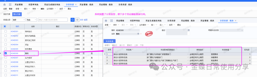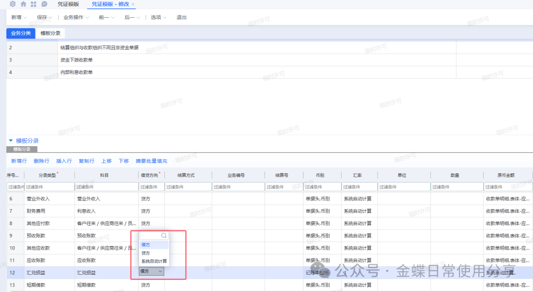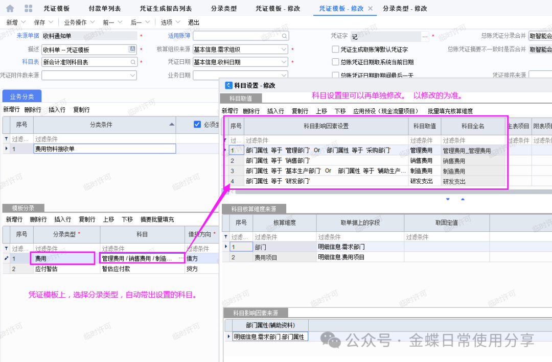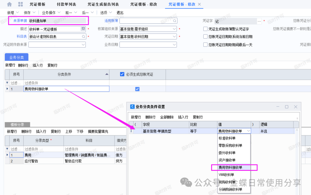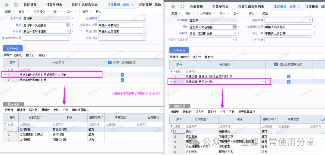 ② 举例说明:应付单有两个单据类型——标准应付和费用应付,两种单据类型账务处理不同,那么在设置凭证模板时应该设置两个业务分类,一个业务分类的单据类型=标准应付,一个业务分类的单据类型=费用应付,两个业务分类所对应的模板分录是不同的。单据生成凭证时系统会自动判断满足哪个业务分类从而生成对应的分录。