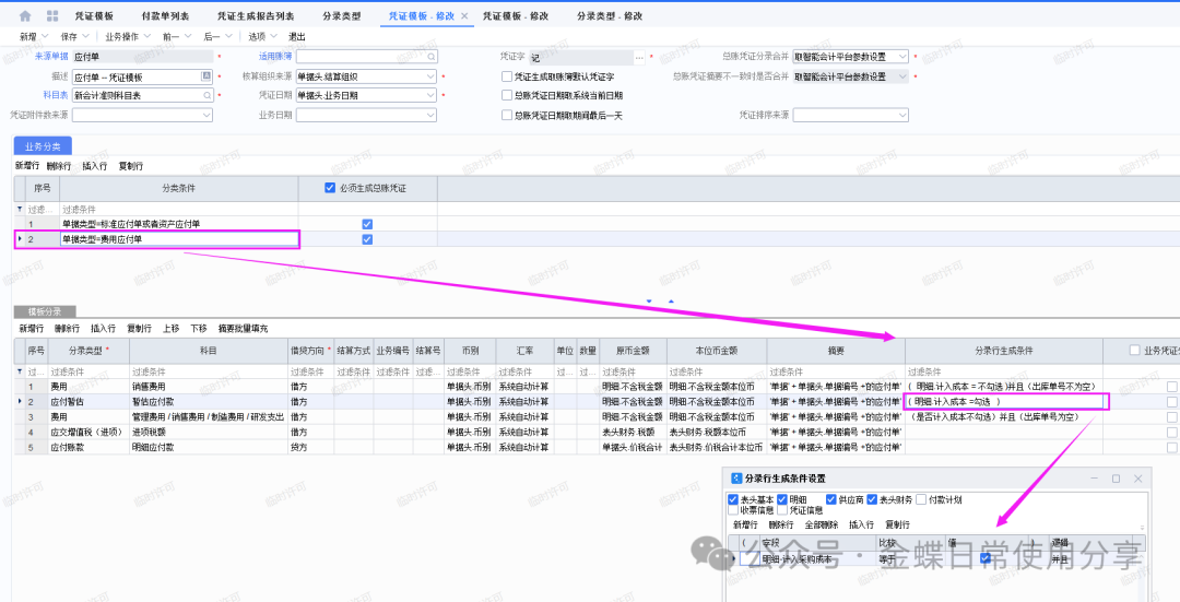 ② 举例说明:应付单——费用应付单分录上有个【计入成本】复选框,是否计入成本在账务处理时要求进不同的科目,计入成本冲减应付暂估科目,不计入成本则进费用科目;那么在设置凭证模板时就应该这么设置:一条分录的借应付暂估,分录行生成条件是计入成本,另一条分录是借费用,分录行生成条件是不计入成本。单据生成凭证是系统会自动判断满足哪个分录行生成条件从而生成对应的分录。