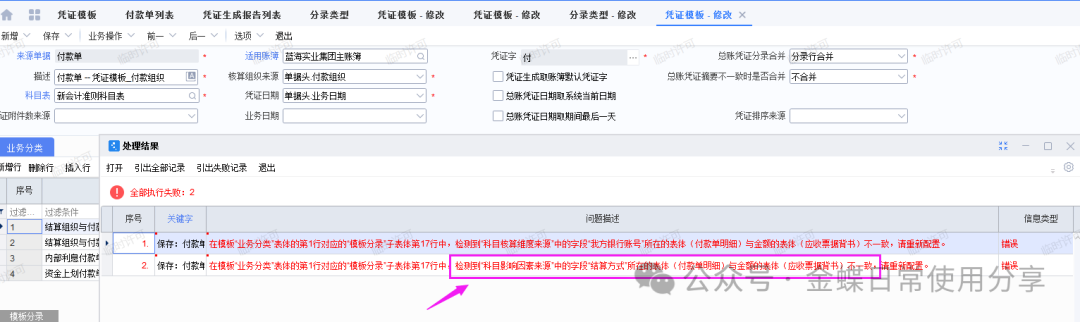 ① 若模板分录的金额设置取的是表头字段,模板分录的其它要素(科目影响因素来源、核算维度、币别、摘要、结算方式、结算号、分录行生成条件)也应该设置成取表头字段;若金额取表头字段,其它要素取表体字段,可能会导致取不到值甚至引起凭证生成中断。