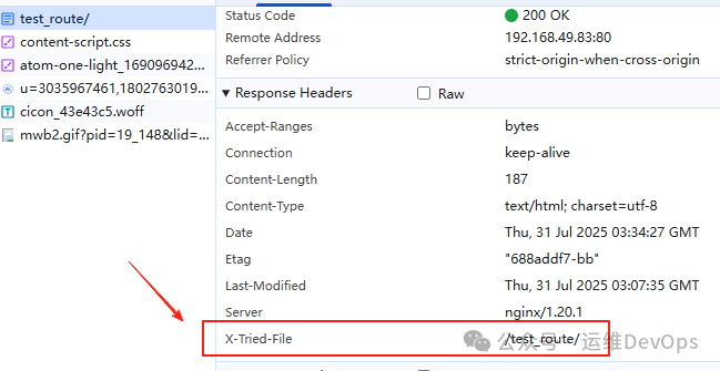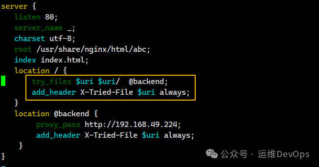上述配置理解为:如果默认情况下什么路由都不加,那么请求到abc/index.html,如果请求的时候加了一个路由,比如 “ip/about.txt”,那么首先会查找abc路径下是否有about.txt文件,此时about.txt对应的就是"$uri",如果没有找到about.txt,那么继续查找abc路径下是否有about.txt目录,这个about.txt目录对应的就是”$uri/” ,如果有,那么就请求about.txt目录的内容,如果也没有这个目录,那么就返回默认的页面,也就是最开始的abc/index.html注:找about.txt目录下的文件默认也是index.html(1)、如果什么路径都不加,直接使用IP访问,默认会找到abc下的index.html,如图:(2)、在abc目录下定义about.txt目录,在此目录下定义index.html文件,写入内容,通过ip/about.txt访问,如图:注:因为abc目录下没有about.txt文件,但是有about.txt目录,因此跳过$uri,继续找$uri/,找到了并返回结果(3)、在abc目录下定义test.txt文件,写入内容,此时通过ip/test.txt访问,如图:此时符合了第一个$uri,因此不会继续向后面查找了(4)、直接通过ip请求未知的资源路径,ip/gong.doc,回到了默认页面,如图:因为abc路径下不存在gong.doc也不存在这个目录,因此就会找到最终的/index.html2、检查静态文件是否存在,不存在则转发到后端应用,源nginx的配置,如图:上图中的配置可以理解为如果请求的路由不匹配$uri和$uri/,那么会转发到@backend的后端服务,这个backend名称是自定义的,因此如果请求http://192.168.49.83/test_route的时候,但是本地没有对应的匹配,因此会转发到http://192.168.49.224/test_route,这个test_route会带到后端去的(1)、修改49.224的nginx配置文件,添加内容如图:注:在后端的nginx配置中,也要有这个test_route路由,否则会报404错误(2)、在/data/html目录下新建test_route目录并定义index.html文件,如图:(3)、此时通过源IP来请求test_route路由,因为当前没有匹配,就会跳转到后端服务去,如图:add_header X-Tried-File $uri always;