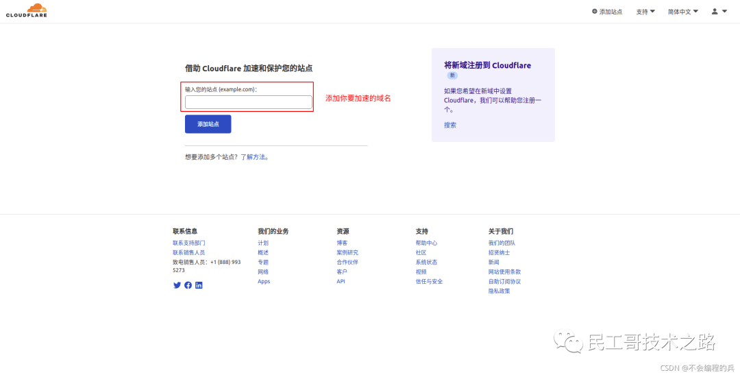 添加站点(你的域名):添加网站,要填写网站根域名,就是你购买域名时的完整域名名称(没有添加任何前缀)
