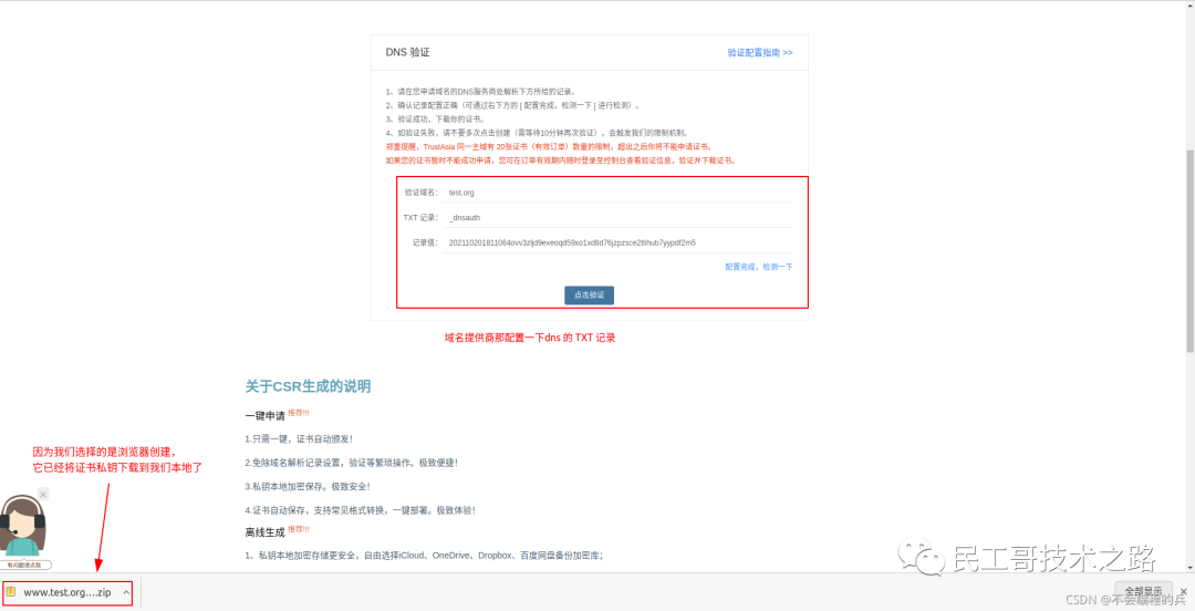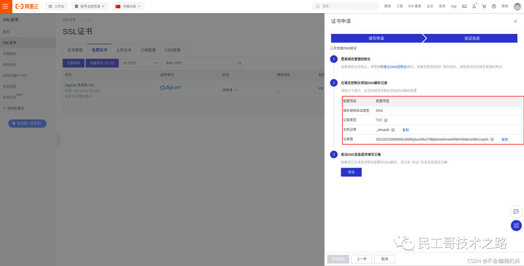 域名提供商(云平台DNS解析)处配置TXT记录值