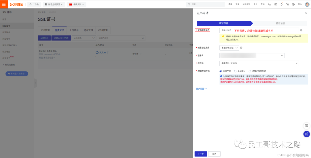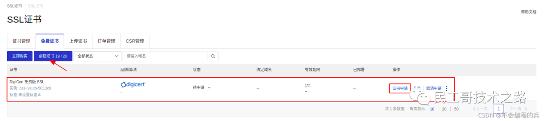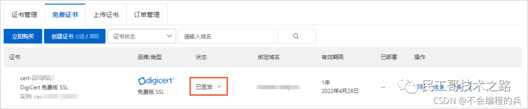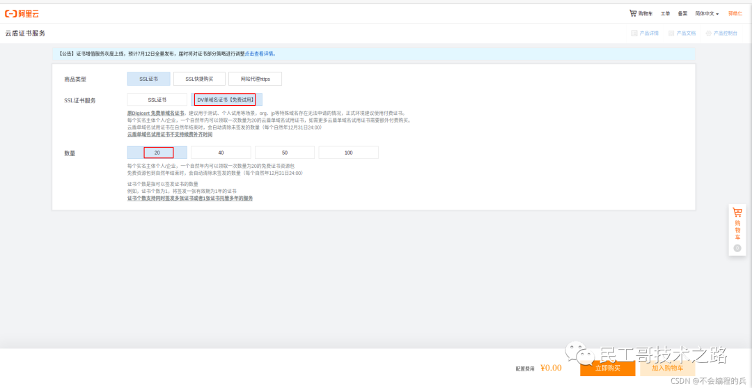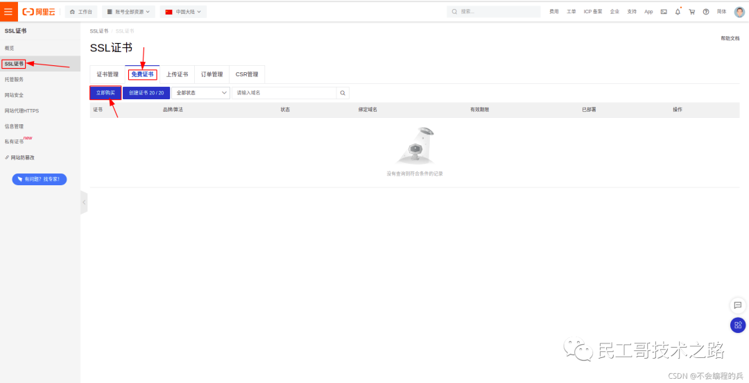 我这里已经购买过了,阿里云免费证书 一个自然年只能买一次,一次有20个针对单个域名申请的机会