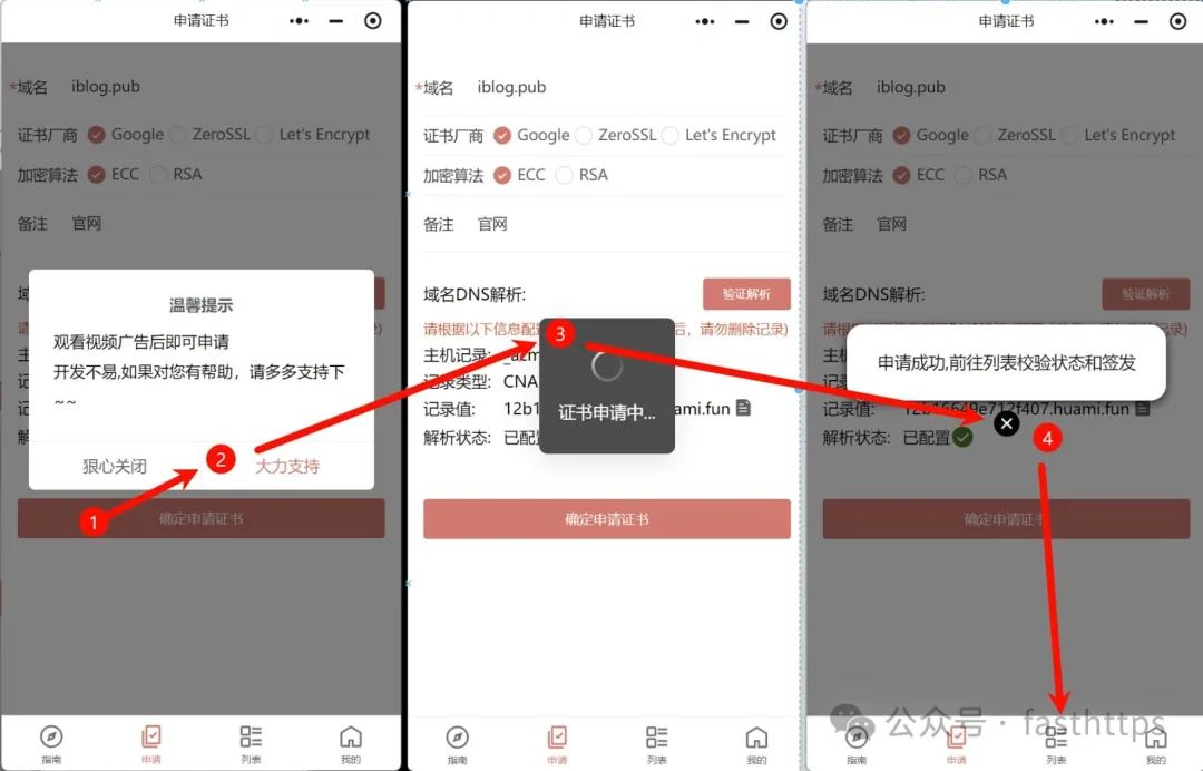 - 点击大力支持后,观看视频广告后即可申请证书,这个申请过程大概需要 20-30 秒耐心等待即可,不要关闭,然后会弹窗成功提示。关闭后自动跳转到列表界面。