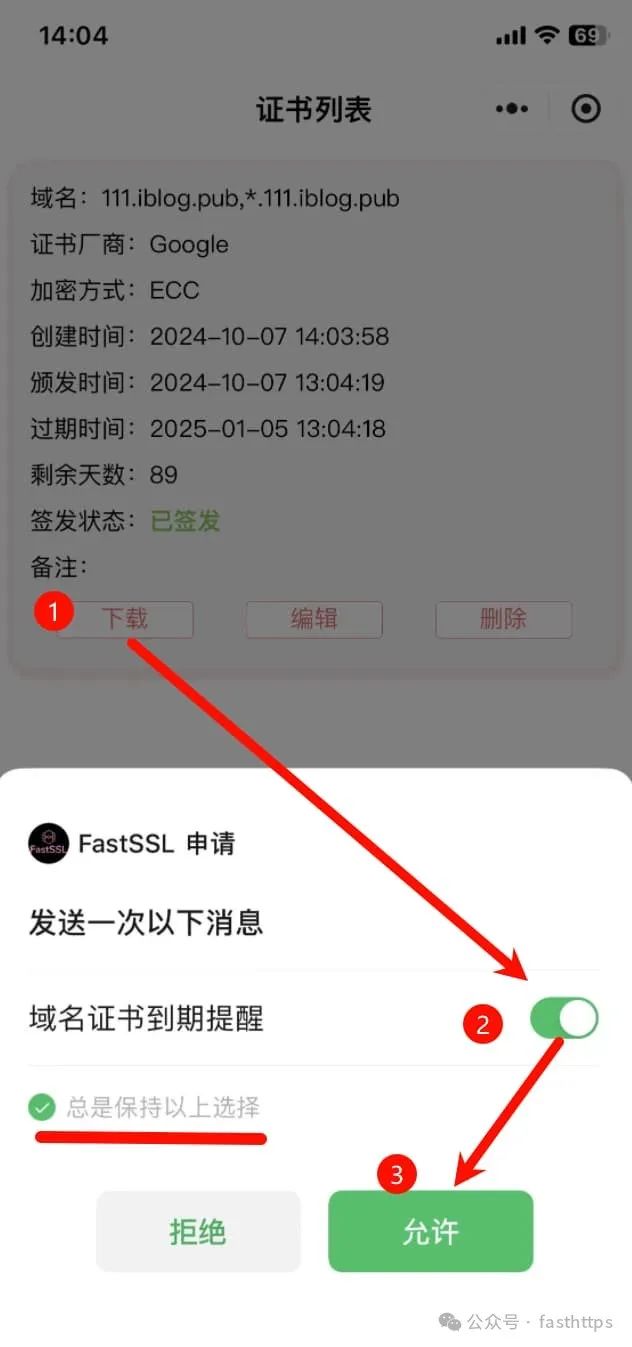 点击下载按钮会有小程序消息通知订阅提醒,点击允许即可,证书快到期的 15 天会有通知提醒。勾上总是保持以上选择,下次点击就不会弹窗了直接就复用上次选择。然后选择允许即可显示下载弹窗。