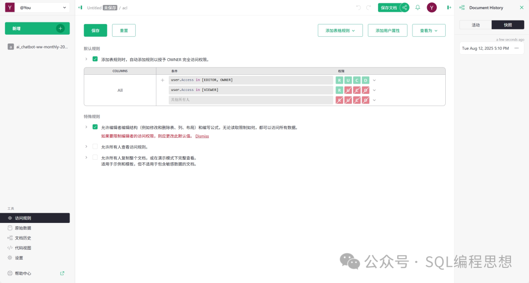 • • 精细化权限控制:支持文档、行列级权限,结合 SSO 登录实现企业级数据安全管控。