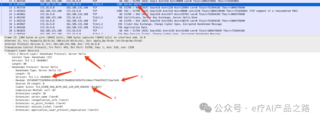 2. 客户端支持的TLS版本为TLS 1.2 (0x0303), 其中0x0303为内部版本号,如TLS1.3为0x0304