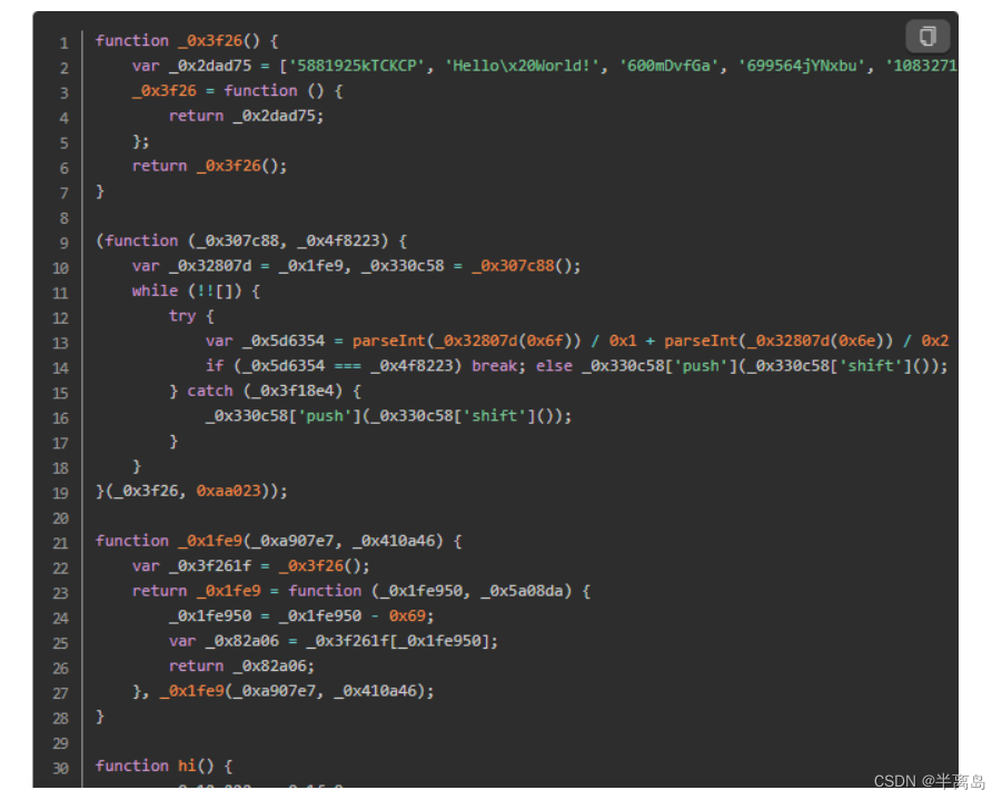 例如在上面的例子中,_0x3f26() 方法就定义了一个大数组,自执行函数里有 push、shift 关键字,主要是对大数组进行移位操作,_0x1fe9() 就是解密函数,hi() 就是加密后的函数。