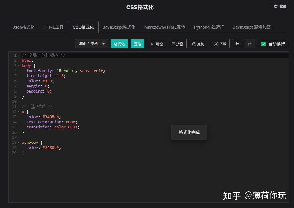 CSS格式化与深度美化: 能够依据标准化规范,对CSS代码进行深度整理与美化,显著提升代码的结构清晰度与可维护性。平台支持自定义缩进策略,包括但不限于2空格、4空格及制表符(Tab)等多种主流方式。
