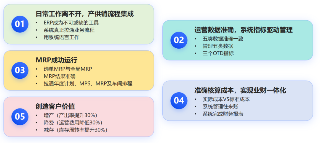 通过ERP系统的上线、运行及持续改进,真正实现了增产:营收至少增加30%、降费:各项管理费用至少降低30%、减存:库存周转率至少提升30%