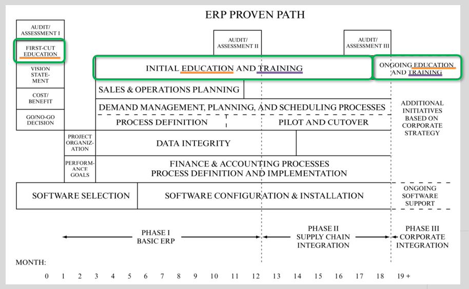 请注意看上面的图片,Education也就是理论培训,会贯穿整个ERP项目。也就是说,在项目启动以前,在整个实施阶段,在系统上线以后,都会有Education。而Training也就是操作培训,在ERP项目启动以后,也会一直存在。