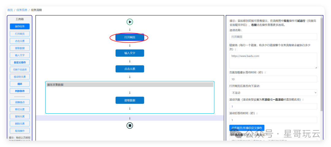 这里可以看到任务的详细流程,点击中间的“打开网页”等流程,在右侧会显示这一步的具体操作。