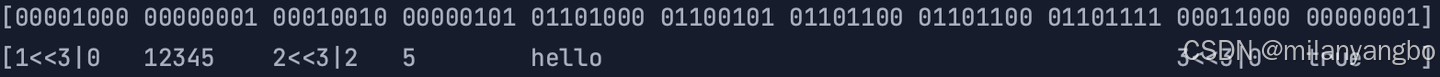 二进制流:[00001000 10111001 01100000 00010010 00000101 01101000 01100101 01101100 01101100 01101111 00011000 00000001]