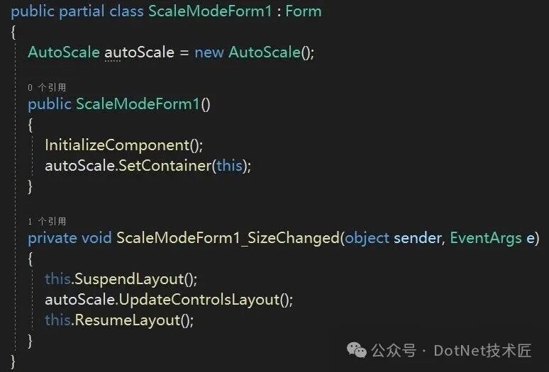 在窗体的 SizeChanged 事件中初始化 AutoScaleHelper 实例,并指定缩放区域(容器):