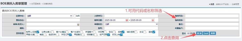 6.进入入库界面后,查询对应的BOE组件来料单,如果找不到可以通过编号和名称查找。最后点击查询。 同时有需要的话可以在下方勾选自己想要的显示选项。 ![]() 7.查询到对应订单之后,按图操作:先进行入库,再上传BOE。 ![]()