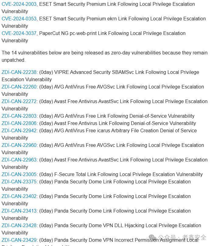 假如这是典型杀毒软件磁盘扫描功能中的一个代码片段——它获取文件路径,使用恶意软件特征库检测该文件数据,若发现有问题则删除该文件。 恶意程序可以创建一个文件,填入特定杀毒引擎能检测到的字节(例如,写入 EICAR 字符串),通过某种方式触发杀毒扫描(比如尝试读取该文件以触发实时防护扫描),随后迅速将该文件替换为指向其他文件的符号链接。 这就形成了众所周知的条件竞争:is_infected_file()处理的是一个文件,但remove_file()可能会处理另一个文件!路径虽然相同,但在这两个函数中指向了不同文件:一个是检测到有问题的常规文件,另一个是指向他处的符号链接。 So,remove_file()将删除符号链接指向的目标(该目标可由攻击者指定)。如果这个目标是杀毒软件自身的EXE,那么就会发生以下这种搞笑事情 比如有一个以NT AUTHORITY\SYSTEM身份运行的杀毒服务。黑客在设备磁盘上放置恶意的EICAR测试文件,随后开始循环检查文件的最后访问时间戳”,试图检测其文件是否被访问。当杀毒软件访问该文件并识别出恶意内容后,尝试将其从磁盘删除。然而就在此时,黑客将其文件替换为符号链接——该链接通过结合NTFS挂载点与对象管理器符号链接,最终指向杀毒软件自身的核心文件。如此一来,杀毒软件便完成了自我删除的窒息操作 见上图,存在任意文件删除漏洞的安全产品可不少呢,虽然很多都已经修复勒无法复现。但别担心,兄弟,软柿子始终都是有的,经过测试还有很多存在这种漏洞,为了避免风险,这里以Windows Defender为例...... 实战案例:Windows Defender的符号链接攻击每当有新版本更新时,WinDefend服务都会创建一个以新下载的版本命名的新文件夹,并将其放置在“ C:\ProgramData\Microsoft\Windows Defender\Platform ”文件夹中。新文件夹包含新版WinDefender的所有可执行文件。 当 Windows Defender 从旧版本过渡到新版本时会发生什么 ?