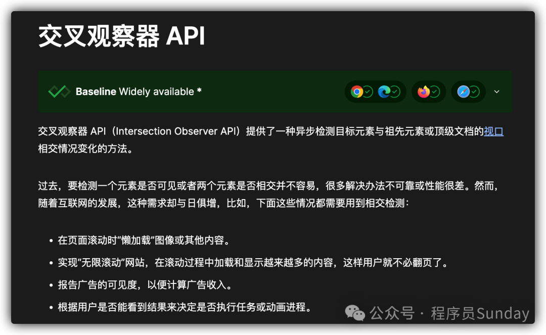 IntersectionObserver 是浏览器提供的一个 API,它允许你观察某个 DOM 元素是否进入或离开视口(或某个指定容器),从而可以在适当时机触发事件,比如:
