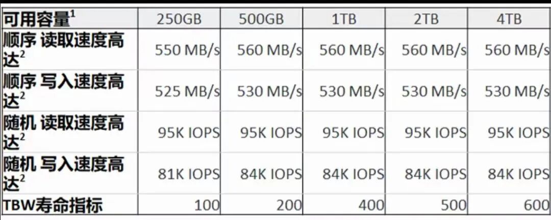 笼统的判断固态硬盘的使用寿命可通过“TBW”参数来判断,不同厂家因“存储芯片质量”、“写策略”等不同,同容量的固态硬盘的BTW也可能不同: