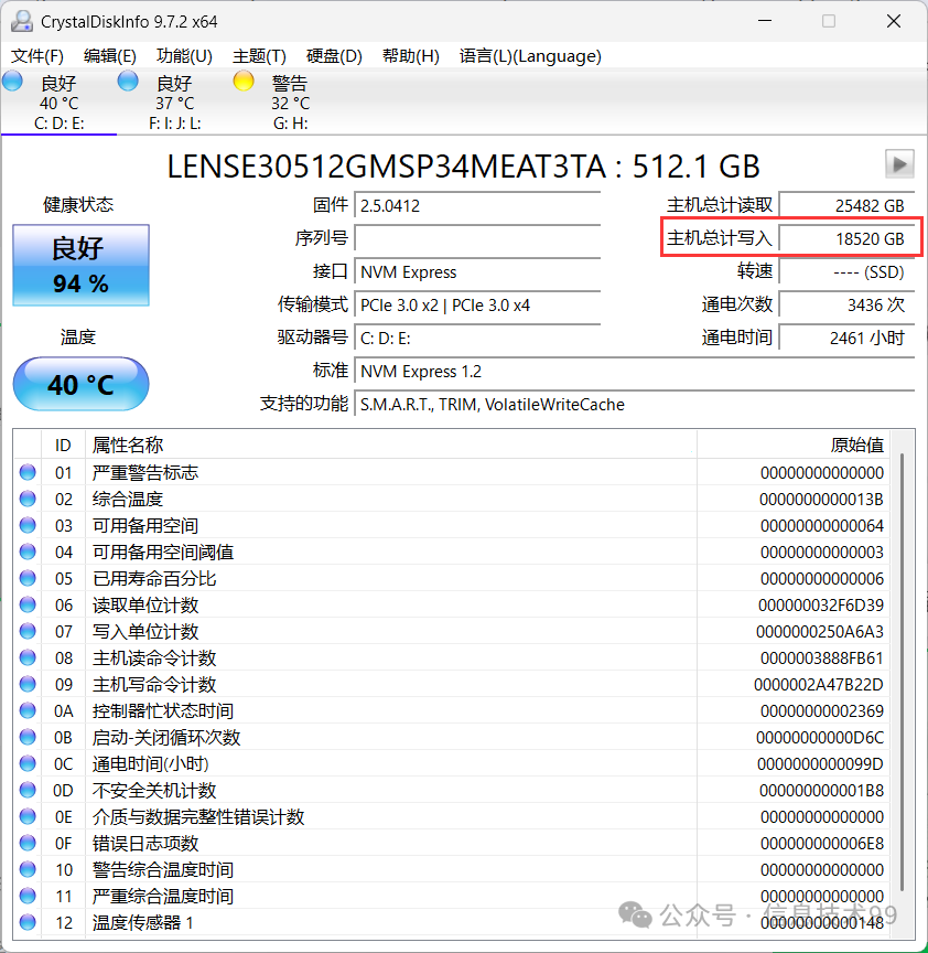 使用CrystalDiskInfo等软件可以查看固态硬盘的已写入量,比如我2019年的笔记本固态硬盘到现在6年的写入量是18TB,按最低100T的总写入量有20%,总共可用30年。但实际上的使用寿命与存储芯片本身质量有关: