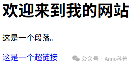 <!DOCTYPE html><html>  <head>  <title>我的第一个网页</title>  </head>  <body>    <h1>欢迎来到我的网站</h1>    <p>这是一个段落。</p>    <a href="https://example.com">这是一个超链接</a>  </body></html>