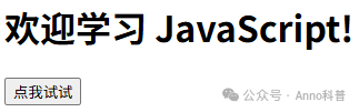 <!DOCTYPE html><html><head>  <title>JS 示例</title></head><body>  <h1>欢迎学习 JavaScript!</h1>  <button onclick="sayHello()">点我试试</button>
