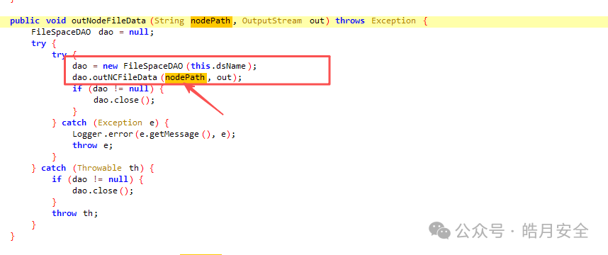 实现从数据库中映射路径获取读取的文件内容,并调用new OutNCFileDataProcessor(out).handleResultSet(rs); 将读取内容写入响应对象,整个过程中没有对传入的反序列化数据校验,且没有校验获取的path是否可以路径穿越以及是否通过绝对路径读取敏感文件内容