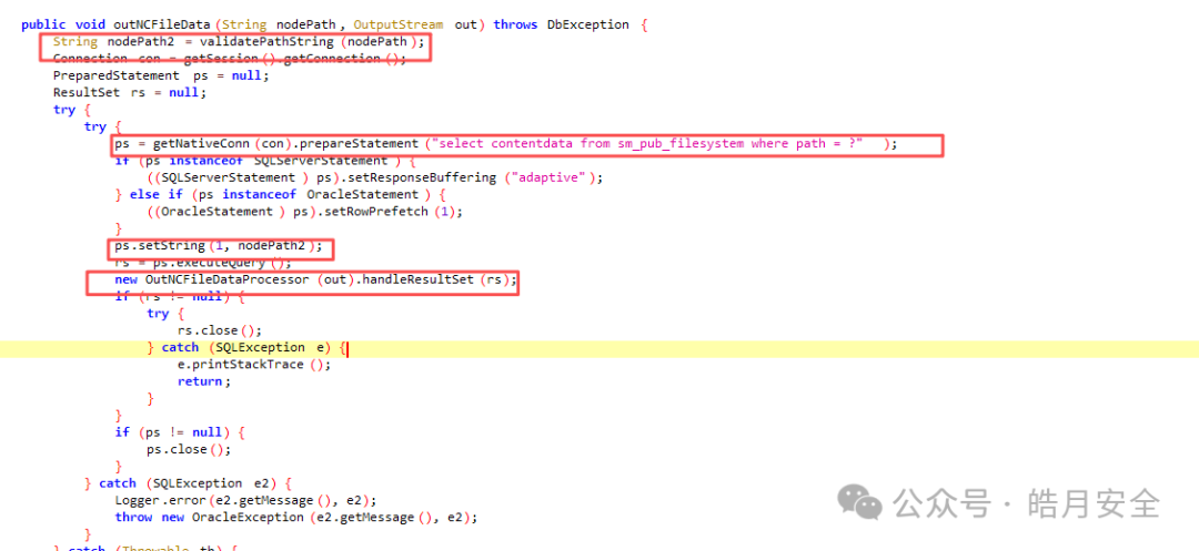 随后直接调用ps = getNativeConn(con).prepareStatement("select contentdata from sm_pub_filesystem where path = ?");