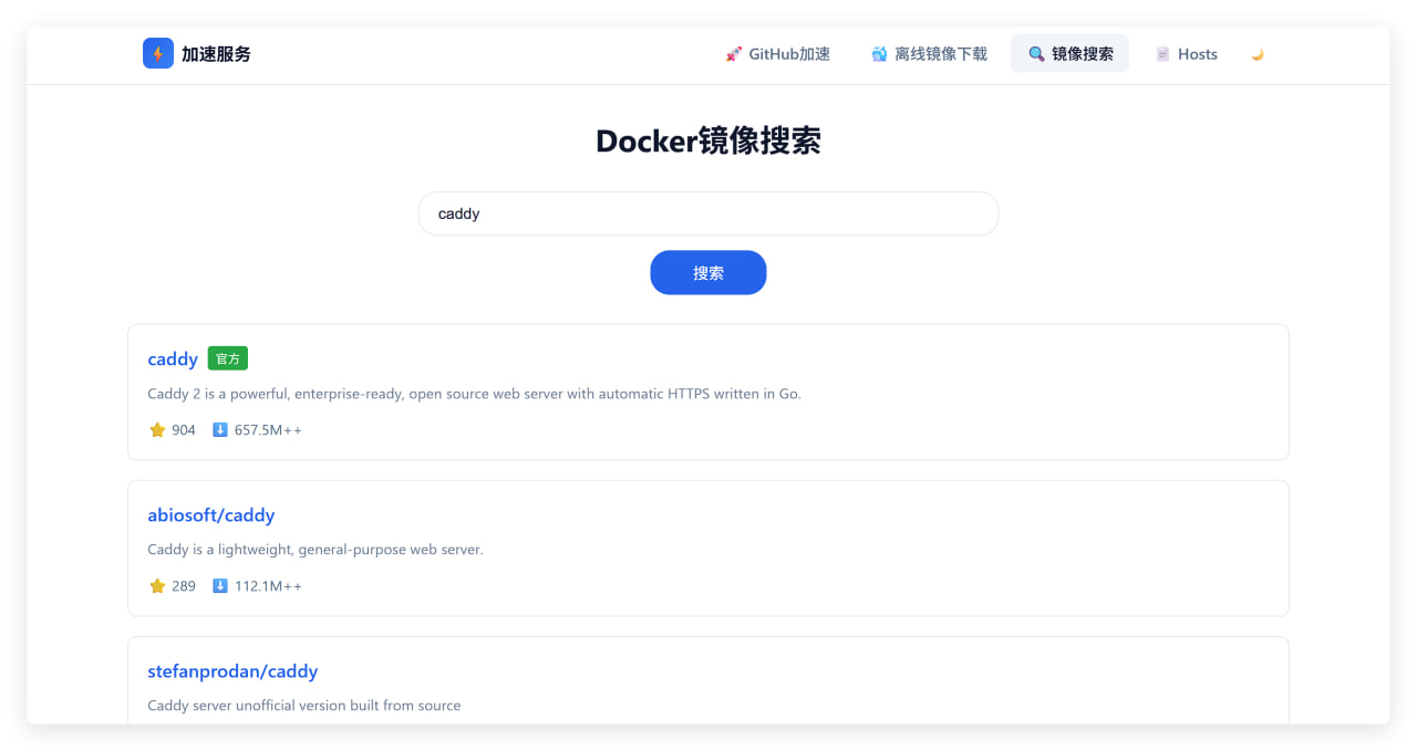 一个轻量级、高性能的多功能代理服务,提供 Docker 镜像加速、GitHub 文件加速、下载离线镜像、在线搜索 Docker 镜像等功能。