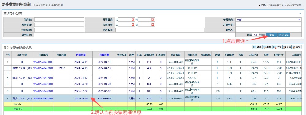 5.提交之后,可以到左侧功能菜单里找到“委外入库发票管理” 点击进入后,按图操作:点击查询,就能看到刚才提交的发票信息明细。 点晴模切ERP更多信息:http://moqie.clicksun.cn,联系电话:4001861886 该文章在 2025/9/26 10:08:25 编辑过 |