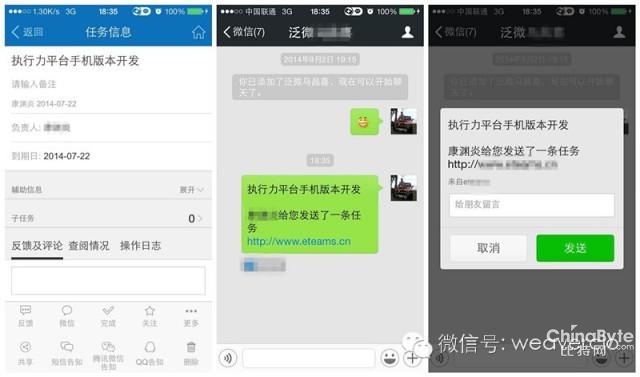 企业号来了,微信再一次以其移动互联网第一入口的绝对优势引来一片膜拜。对于管理软件厂商而言,尤其是被企业赋予移动办公统一入口使命的协同OA而言,这幸福来得有些特别:因为企业号的推动,大把的移动互联用户都顺理成章成为他们的服务对象。 那么,管理软件如何通过微信服务于系统用户呢?以泛微协同OA为例,大概有以下三种方式: 第一种接入方式:在APP应用中直接发微信提醒 在PC时代,新建一个流程/任务,如果可以通过短信或者邮件提醒就已经很满足了,而后PC的移动互联时代,如果你晓得泛微OA可以在APP中发起微信提醒,还能保持淡定吗?据了解在泛微OA手机客户端中,用户新建任务、流程或者其他的应用,需要及时通知同事时, 可以通过下方的按钮“微信”给他(如下图),只要这位同事是你的微信好友就可以!