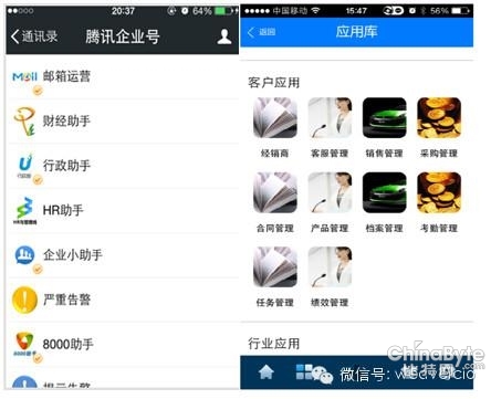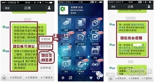 第三种方式:接入微信企业号 在微信的官网描述中,企业注册微信企业号之后,可自由配置多个“子号”来对接企业的多种不同应用,并且可自由无限制向用户推送消息(这一点跟第一种方式的效果异曲同工)。在笔者看来,微信企业号对于协同OA软件的杀伤力在于,微信企业号提供了统一入口,使得用户无需安装任何APP就能够与企业内部的IT平台进行交互,这对于移动信息化的推广大有裨益。