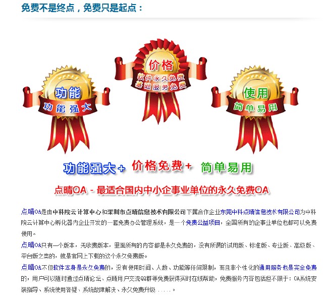 对于中小企业来说,点晴OA系统真的的不错的免费OA系统。咨询他们的客服了解到,点晴OA系统http://oa.clicksun.cn  )不仅是永久免费的,而且是不限用户数,这样企业就不用为购买多少用户的OA系统而烦恼,而且点晴OA系统的功能是全开放的,系统安装只需要一键安装就可以快速搭建起来,而且数据库都是在自己公司的服务器上,系统又有多重安全措施,所以不需要担心信息泄漏的问题。